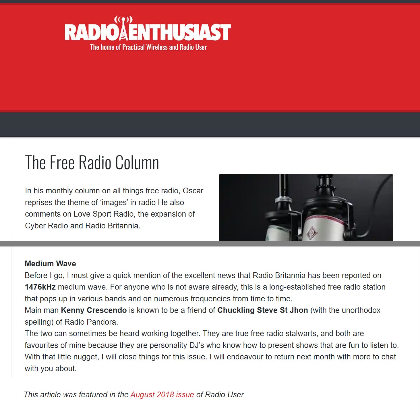 Columninst Oscar praises Radio Britannia in Radio User, August 2018